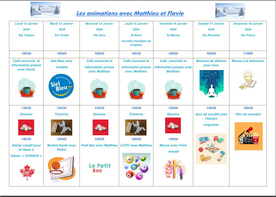 L'animation tient une place essentielle dans la vie de notre établissement. Le planning des activités de la semaine est distribué en chambre. Nous priorisons les activités physiques afin d’entretenir la forme et de prévenir les chutes.